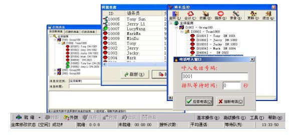 擁有管理員使用許可的桌面工具提供了比一般座席使用許可更加強大的功能,它不僅允許管理員對所屬座席進(jìn)行監(jiān)控、監(jiān)聽、強插、強拆等特殊操作,還可以進(jìn)行消息的組播、廣播,以及更改LED大屏幕顯示內(nèi)容等操作。另外,座席的新增、刪除、分組等操作也必須由管理員工具來完成。