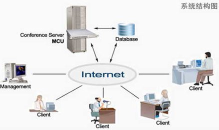 經(jīng)過種種測試,最后選定視維Super-V視頻會議系統(tǒng),山大聯(lián)潤研發(fā)的視維視頻會議系統(tǒng)由服務(wù)器端軟件和客戶端軟件兩部分組成。其中安裝服務(wù)器端軟件的PC服務(wù)器必須有公網(wǎng)固定的IP地址;有較好的網(wǎng)絡(luò)帶寬條件,以保證正常的音視頻信號的傳輸。所有會議成員都需要在其個人計算機上安裝客戶端軟件,可以根據(jù)具體情況接入IP網(wǎng)絡(luò)。視維Super-V視頻會議系統(tǒng)將所參會人員通過IP網(wǎng)絡(luò)連接起來,提供音頻、視頻以及數(shù)據(jù)協(xié)作等通訊服務(wù)。其網(wǎng)絡(luò)拓?fù)鋱D如下: