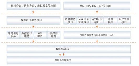 視維系統(tǒng)是一個(gè)基于IP網(wǎng)絡(luò)的綜合業(yè)務(wù)通訊平臺(tái),通過(guò)多網(wǎng)絡(luò)接入方式實(shí)現(xiàn)網(wǎng)通、電信、聯(lián)通等用戶(hù)間高速互通;通過(guò)H.323模塊將企業(yè)內(nèi)部原有的硬件設(shè)備與視維系統(tǒng)鏈接起來(lái),有效的節(jié)約了投資;其他如SIP模塊,短信模塊,固網(wǎng)電話(huà)接入等都可以根據(jù)用戶(hù)需要進(jìn)行擴(kuò)展。視維系統(tǒng)可以支持分布式視頻服務(wù)器集群,可利用企業(yè)內(nèi)部網(wǎng)絡(luò)或者互聯(lián)網(wǎng)構(gòu)建超大規(guī)模企業(yè)綜合通訊平臺(tái)。基于“面向服務(wù)體系架構(gòu)(SOA)”設(shè)計(jì)架構(gòu),實(shí)現(xiàn)很靈活地方便地與其業(yè)務(wù)系統(tǒng)如OA,HR,CRM, ERP…等進(jìn)行集成,SOA架構(gòu)將應(yīng)用系統(tǒng)的重點(diǎn)放在服務(wù)的實(shí)現(xiàn)和部署上,通過(guò)定義與平臺(tái)及技術(shù)無(wú)關(guān)的通用接口將各種服務(wù)松散耦合在一起,企業(yè)原有的應(yīng)用也可以通過(guò)接口調(diào)用這些服務(wù),從而實(shí)現(xiàn)更加豐富靈活、可不斷按需擴(kuò)展的商業(yè)流程和業(yè)務(wù)功能。SOA架構(gòu)如下: