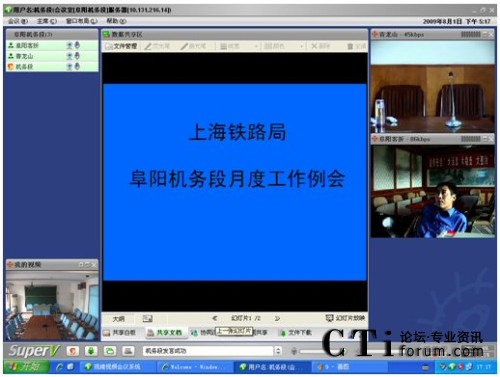 CTI論壇(ctiforum)08月06日消息: 日前,京九干線主力機務段——上海鐵路局阜陽機務段成功啟動視維Super-V視頻會議系統(tǒng)。阜陽機務段的領導和職工,每天早上8點上班后,第一件事情就是登陸視頻會議系統(tǒng),匯報前日工作情況、部署當日工作內容。已然,山大聯(lián)潤為上海路局阜陽機務段部署的阜陽機務段視頻會議系統(tǒng),成為鐵路部門必不可少的遠程溝通交流工具,在有效提高鐵路系統(tǒng)溝通效率的同時,保障了鐵路運輸?shù)陌踩,極大滿足了鐵路部門暑期運營業(yè)務對溝通和會議的需求。