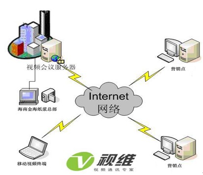 視維團(tuán)隊(duì)根據(jù)海南金海紙漿的網(wǎng)絡(luò)現(xiàn)狀和IT硬件資源以及低碳環(huán)保高效溝通的需求設(shè)計(jì)了一套經(jīng)濟(jì)可行的視頻會(huì)議系統(tǒng)解決方案,以海南金海紙漿為主會(huì)場(chǎng),全國(guó)各營(yíng)銷(xiāo)點(diǎn)為分會(huì)場(chǎng)。拓?fù)鋱D如下: