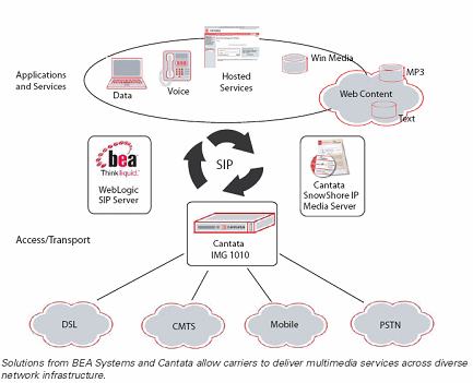 BEA提供領(lǐng)先的SOA基礎(chǔ)架構(gòu),同時(shí)它還提供可以在即使是完全不同的IT環(huán)境中建立應(yīng)用和管理SOA的強(qiáng)大的、 基于標(biāo)準(zhǔn)的平臺(tái)。BEA WebLogic Communications Platform (WebLogic 通信平臺(tái))是第一個(gè)提供在運(yùn)營(yíng)商級(jí)環(huán)境中、全業(yè)務(wù)功能的融合IT和電信的平臺(tái)。它使得運(yùn)營(yíng)商可以通過(guò)加強(qiáng)利用固網(wǎng)和無(wú)線網(wǎng)開(kāi)展多樣的數(shù)字內(nèi)容和視頻服務(wù)的能力,從而增加收入。其WebLogic SIP 服務(wù)器提供了必需的呼叫建立和會(huì)話管理,但是,運(yùn)營(yíng)商仍然需要高級(jí)的媒體處理能力,以及能夠與BEA 解決方案進(jìn)行互操作的標(biāo)準(zhǔn)接口,從而使得運(yùn)營(yíng)商可以提供可擴(kuò)展的語(yǔ)音、視頻和多媒體服務(wù)。他們同時(shí)需要有媒體網(wǎng)關(guān)以實(shí)現(xiàn)跨網(wǎng)絡(luò)的連接。Cantata與BEA Systems 合作,提供與BEA的WebLogic SIP服務(wù)器可靠的交互操作性,同時(shí),運(yùn)營(yíng)商可以利用Cantata的SnowShore IP媒體服務(wù)器以及集成媒體網(wǎng)關(guān)1010實(shí)現(xiàn)跨固網(wǎng)和無(wú)線網(wǎng)語(yǔ)音和多媒體服務(wù)。