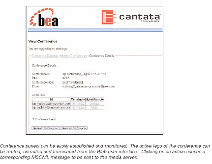 該應(yīng)用是利用BEA WebLogic workshop編寫(xiě)的,運(yùn)行于 BEA WebLogic SIP 服務(wù)器上。用戶通過(guò)BEA WebLogic門(mén)戶提供的圖形界面建立會(huì)議。BEA WebLogic SIP 服務(wù)器利用SIP協(xié)議與Cantata SnowShore IP Media Server(Cantata SnowShore IP 媒體服務(wù)器)進(jìn)行通信,同時(shí)它還使用了MSCML控制媒體處理功能。通過(guò)使用XMLBeans, 該應(yīng)用產(chǎn)生并編譯了MSCML。XMLBeans是一個(gè)由BEA公司開(kāi)發(fā)的開(kāi)源XML綁定工具。 BEA WebLogic Workshop工具使得開(kāi)發(fā)人員可以很容易地創(chuàng)建這些通過(guò)使用SnowShore 媒體服務(wù)器開(kāi)創(chuàng)的面向Web的SIP和XML接口的融合應(yīng)用。