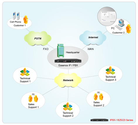 Essence IPBX系列可以注冊者之形式注冊于其他SIP協(xié)定伺服器上,如ITSP運(yùn)營平臺(tái),或是分公司之小型IP PBX注冊至總公司之大型IP PBX ,均可透過Internet 將話務(wù)無限延伸。