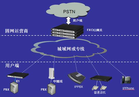 “固網(wǎng)IP化”方案無需軟交換,延用現(xiàn)有的數(shù)字程控交換機與業(yè)務支持系統(tǒng)作為核心網(wǎng)業(yè)務平臺,只是在交換機外圍增加實現(xiàn)模擬/數(shù)字語音信號轉(zhuǎn)換成IP的VoIP網(wǎng)關,并通過IP網(wǎng)絡實現(xiàn)與遠程客戶終端設備的連接。遠程的用戶端設備可以是傳統(tǒng)設備,如普通電話、傳真機或小型交換機,也可以是基于IP的語音設備,如SIP電話、IPPBX等(如下圖所示)?梢詫崿F(xiàn)小區(qū)放號、企業(yè)直線電話、企業(yè)語音交換機接入等業(yè)務。