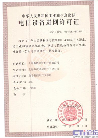 傲威通信AVX系列語音電話交換機獲得“電信設(shè)備進網(wǎng)許可證”