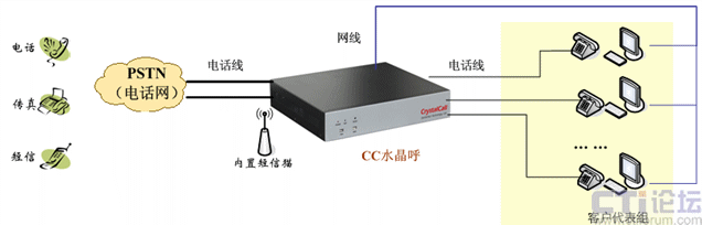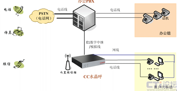 CC水晶呼單獨(dú)組網(wǎng),對外接運(yùn)營商的電話線,對內(nèi)接分機(jī)線,組網(wǎng)說明如下: