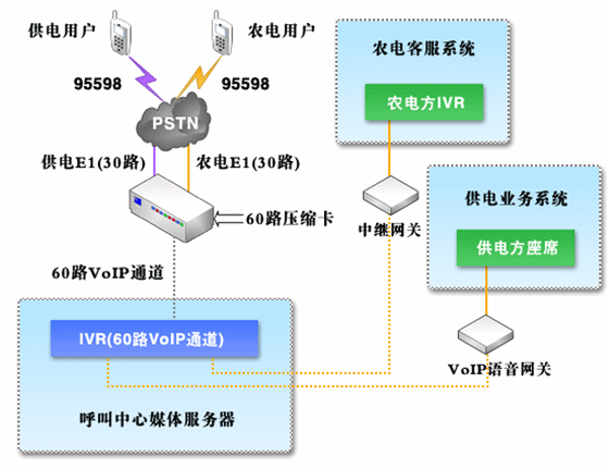 對于呼叫中心系統(tǒng),由95598特別號碼統(tǒng)一接入,并且在供電呼叫中心系統(tǒng)與農(nóng)電呼叫中心系統(tǒng)之間采用中繼方式(模擬中繼或者數(shù)字中繼,視農(nóng)電方實際情況而定)進行話路連接,同時保證系統(tǒng)接入容量及其他資源能夠滿足統(tǒng)一的要求;在自動語音菜單中,分別設(shè)立供、農(nóng)電用戶層,用戶可以自行區(qū)分、選擇,對于農(nóng)電用戶在確定用戶類型之后,通過中繼將話路轉(zhuǎn)接到農(nóng)電方呼叫中心系統(tǒng)。