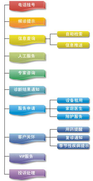 用戶可以通過醫(yī)院呼叫中心的自動語音菜單進行自助式的信息查詢,例如上面介紹過的醫(yī)院簡介、科室介紹、專家介紹、藥品說明與價格、醫(yī)療常識等這些無需人工參與就可以提供的咨詢服務(wù),完全可以由用戶自主查詢,大大減少了人工參與,同時也提高了服務(wù)質(zhì)量。