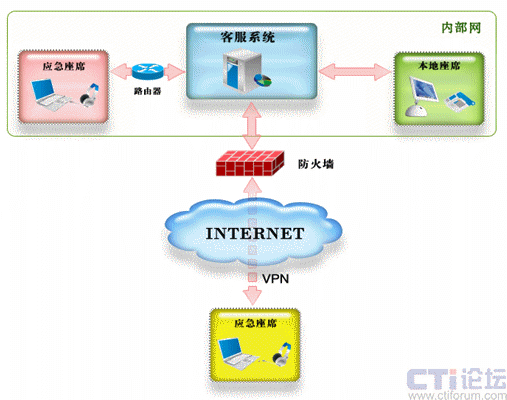 配置應急座席的必要條件之一是網絡環(huán)境,要求應急座席家庭計算機能夠連接到Internet或能夠直接訪問客服系統(tǒng)內部網絡,位于客服網絡防火墻之外需要通過相應的技術連接到系統(tǒng),實現(xiàn)對系統(tǒng)的訪問。