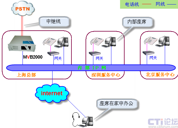在技術(shù)上,MVB2000 的語音業(yè)務通過電信運營商的模擬或者數(shù)字中繼線路接入,數(shù)據(jù)業(yè)務都通過局域網(wǎng)或者互聯(lián)網(wǎng)使用TCP/IP協(xié)議傳送,解決了呼叫中心中大量數(shù)據(jù)傳送的需求,請看下面的網(wǎng)絡組織結(jié)構(gòu)圖: