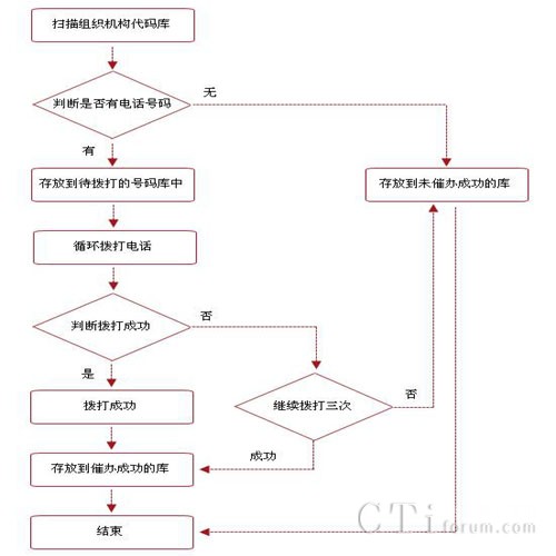 催辦業(yè)務(wù)負(fù)責(zé)完成語(yǔ)音提示。系統(tǒng)自動(dòng)掃描組織機(jī)構(gòu)代碼庫(kù),查詢當(dāng)日需要年檢的組織機(jī)構(gòu)代碼信息,對(duì)沒(méi)有電話號(hào)碼的存入到未催辦的組織機(jī)構(gòu)代碼庫(kù)中,有電話號(hào)碼的存入到待催辦的電話號(hào)碼庫(kù)中,并根據(jù)設(shè)置的時(shí)間撥打手機(jī)號(hào)碼,對(duì)于語(yǔ)音提示成功的,存放到相應(yīng)的庫(kù)中。催辦業(yè)務(wù)后臺(tái)功能包括:
