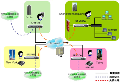 隨著公司在全世界開設(shè)眾多的部門,IP電話技術(shù)將會是不同分公司之間實(shí)現(xiàn)低費(fèi)用高品質(zhì)語音通訊的方式。SINOCO公司的IP-PBX 系統(tǒng)解決方案,利用 SPX-5130設(shè)備通過互連網(wǎng)連接到公司的各個(gè)分支機(jī)構(gòu),提供分級體系結(jié)構(gòu),更進(jìn)一步提供了可靠的,靈活的語音通訊解決方案,從而滿足公司快速回應(yīng)客戶的需求。同時(shí),它也降低了總部和分部之間的電話費(fèi)用。總部和分部間昂貴的國際電話費(fèi)用將不再存在, 而且享受高品質(zhì)的語音通訊質(zhì)量。