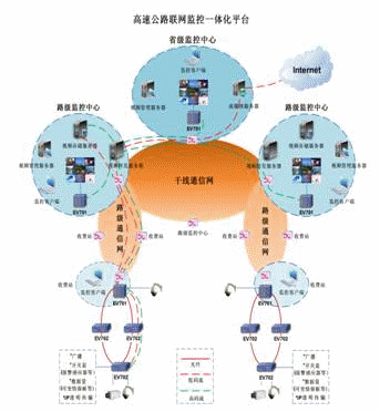 采用H.264編碼標準的EV702外場綜合接入設備,將原來外場分散的攝像頭、快球、云臺、可變情報板、報警感應器等設備融為一體,同時也支持MPEG編碼標準的視音頻接入。EV702配備光纖通信板卡,不需要光端機,可以直接連接光纖,進行遠距離。通過EV702連接成環(huán),并且具有自愈功能?蛇M行集中式(路級監(jiān)控中心)、分布式(各級監(jiān)控中心)存儲。路級中心、區(qū)域中心、省級中心分布式多級監(jiān)控,由省中心統(tǒng)一設定權限,進行集中管理。