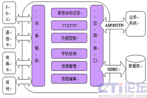 CTI服務(wù)器是整個(gè)系統(tǒng)的核心,通過內(nèi)置電話語音/傳真卡,接入PSTN電話網(wǎng)。該服務(wù)器可作為一個(gè)相對(duì)獨(dú)立的系統(tǒng)單獨(dú)運(yùn)行,也可以通過企業(yè)局域網(wǎng)與企業(yè)的業(yè)務(wù)系統(tǒng)連接。