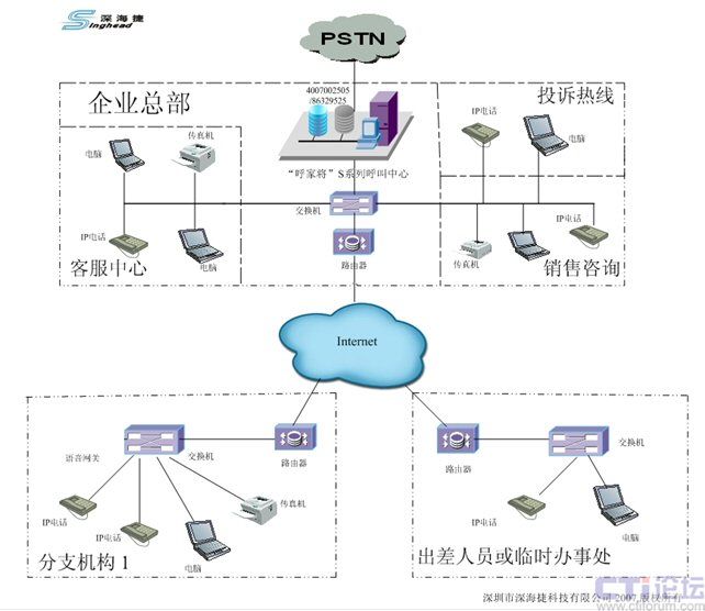 基于“呼家將”呼叫中心系統(tǒng)靈活的組網(wǎng)結構以及強大的系統(tǒng)功能,其完全可以替代傳統(tǒng)的PBX系統(tǒng),洲際大酒店可以在公司總部建立中央呼叫中心系統(tǒng),其配置3條數(shù)字中繼線的接入能力,后續(xù)可以平滑擴充成4條數(shù)字中繼線接入。內線為300部座機,全部使用模擬電話線和電話機,并且可以繼續(xù)平滑擴容,對于臨時辦公人員、出差人員以及外地辦事處,可以使用軟終端或者網(wǎng)關+普通電話的形式接入,其最大的優(yōu)勢是成本低,接入靈活。