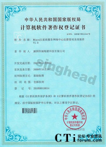 CTI論壇(ctiforum)5月19日消息(記者 楊佳林):2010年4月27日,深圳市深海捷科技有限公司申請(qǐng)的《Mixcall家政服務(wù)網(wǎng)絡(luò)中心運(yùn)營(yíng)管理系統(tǒng)軟件V1.0》著作登記獲得國(guó)家版權(quán)局審核并通過。