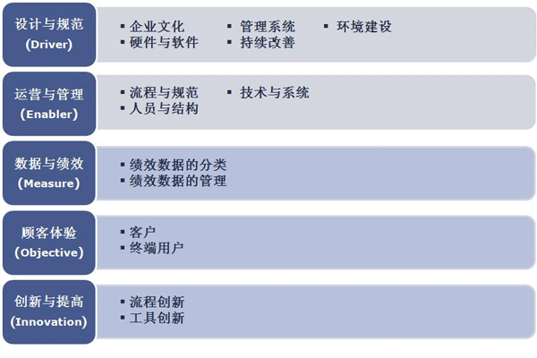 呼叫中心能力成熟度認證涉及設計與規(guī)范、運營與管理、數據與績效、顧客體驗、創(chuàng)新與提高5大類,14項評審指標以及若干個值得關注的管理項目。是一套完整的“客戶為中心”的績效管理工具。