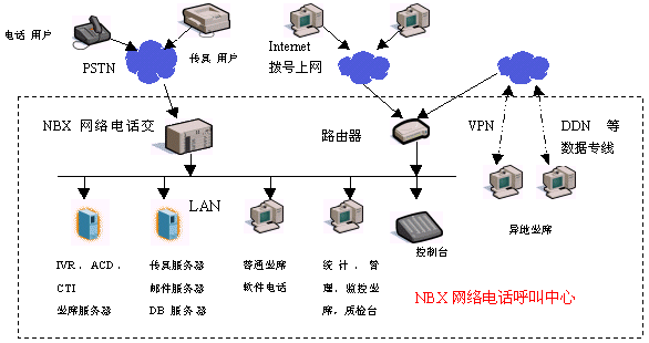 呼叫中心一般又稱為客戶服務中心,指企業(yè)或團體通過公開一個電話特服號碼(如:12315、95000等),提供對客戶的電話服務。NBX網(wǎng)絡電話呼叫中心是基于3Com 公司NBX網(wǎng)絡電話交換機平臺構(gòu)筑的新一代語音、數(shù)據(jù)兩網(wǎng)合一的統(tǒng)一呼叫中心系統(tǒng),支持統(tǒng)一消息服務,統(tǒng)一外部訪問路由,是各類傳統(tǒng)呼叫中心的升級換代產(chǎn)品。