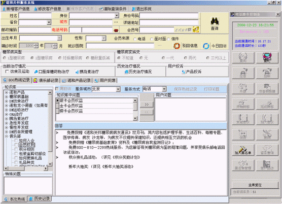 諾和關(guān)懷糖尿病服務(wù)中心的服務(wù)坐席可以實(shí)現(xiàn)患者信息的同步提示功能,當(dāng)電話被分配至坐席的同時(shí),患者的資料信息也同步出現(xiàn)在PC終端上。同時(shí)坐席終端可以自動(dòng)記錄對方的電話號碼,也可以實(shí)時(shí)顯示正在排隊(duì)等待的人數(shù),提示服務(wù)人員加快業(yè)務(wù)受理速度。