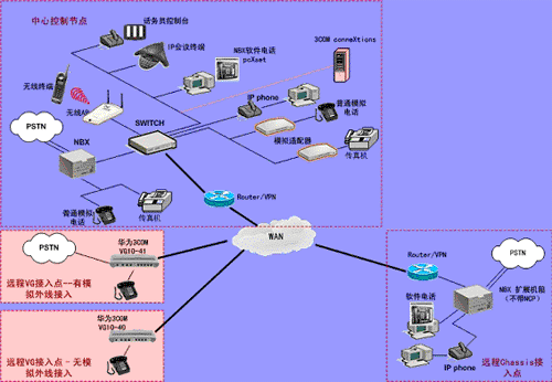 ③.遠程接入的辦公室不再需要專用的 PBX, 只需要將3Com NBX電話終端接入到WAN網中,就能地實現(xiàn)在WAN或Internet上與3Com NBX 網絡電話系統(tǒng)的互連。