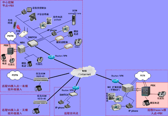 ②.統(tǒng)一的分支機構電話平臺,可以支持任何數(shù)據(jù)骨干網(WAN)技術,包括DDN、幀中繼、VPN、xDSL等。3COM NBX 系統(tǒng)也可以在無線局域網上運行。