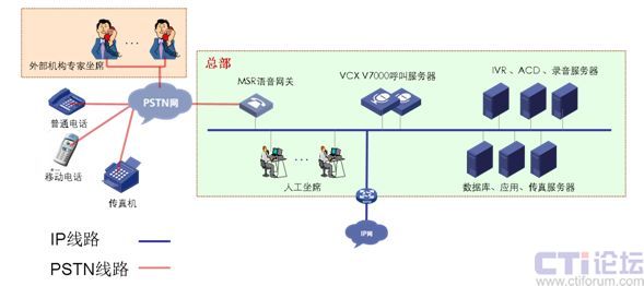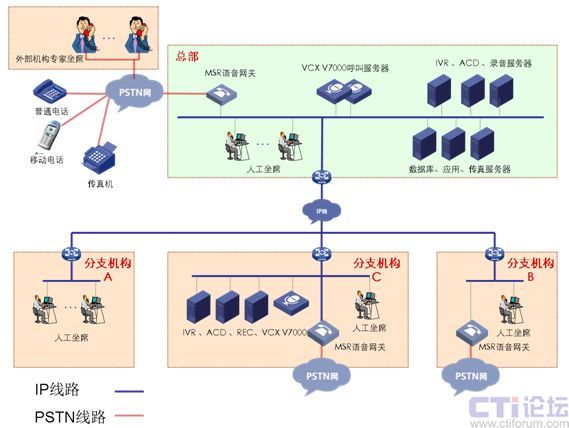 分支機(jī)構(gòu)B:網(wǎng)絡(luò)通過VPN技術(shù)與總部實(shí)現(xiàn)數(shù)據(jù)語(yǔ)音傳輸,部署MSR語(yǔ)音網(wǎng)關(guān)與當(dāng)?shù)豍STN網(wǎng)連接,IP坐席。兩地申請(qǐng)相同的客服號(hào)碼,兩地內(nèi)撥打客服號(hào)碼,客戶無長(zhǎng)途話費(fèi)產(chǎn)生。適用與總部與分支處在不同省市。
