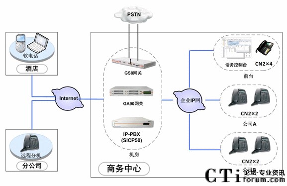 中天凱旋利用企業(yè)內(nèi)部完善的IP通信網(wǎng)絡,在機房部署SICP系統(tǒng),負責整個語音通信系統(tǒng)的服務管理、用戶管理。部署GA90網(wǎng)關和GS8網(wǎng)關,分別使用E1中繼線路和普通模擬線路接入PSTN網(wǎng)絡,保證系統(tǒng)的通信。