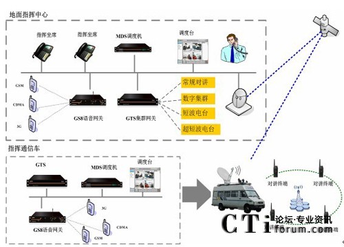 整體系統由地面指揮中心和指揮通信車組成,指揮中心和通信車分別部署調度臺,均可指揮現場。地面指揮中心和指揮通信車通過部署衛(wèi)星設備,通過衛(wèi)星鏈路進行通信,當衛(wèi)星鏈路出現故障時,指揮車也可通過移動網絡(GSM/CDMA/3G)與地面指揮中心互聯互通。