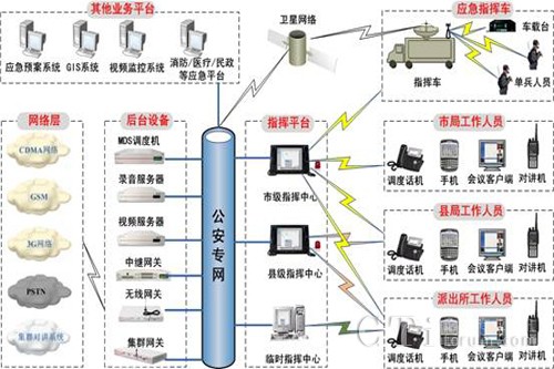 系統(tǒng)基于公安專網(wǎng)部署,融合衛(wèi)星網(wǎng)絡(luò)、PSTN、GSM/CDMA、集群對講網(wǎng)絡(luò)等各種網(wǎng)絡(luò),采用專業(yè)的多媒體調(diào)度平臺實現(xiàn)省、市、縣各級公安機關(guān)之間的互聯(lián)互通和多級指揮調(diào)度,實現(xiàn)語音、視頻、數(shù)據(jù)的同步傳輸和統(tǒng)一調(diào)度。并能和公安部門現(xiàn)有各種業(yè)務(wù)系統(tǒng),如視頻監(jiān)控系統(tǒng)、接處警系統(tǒng)、GIS系統(tǒng)、應(yīng)急預(yù)案系統(tǒng)、數(shù)據(jù)庫系統(tǒng)等集成,實現(xiàn)多系統(tǒng)相互調(diào)用,協(xié)同工作。