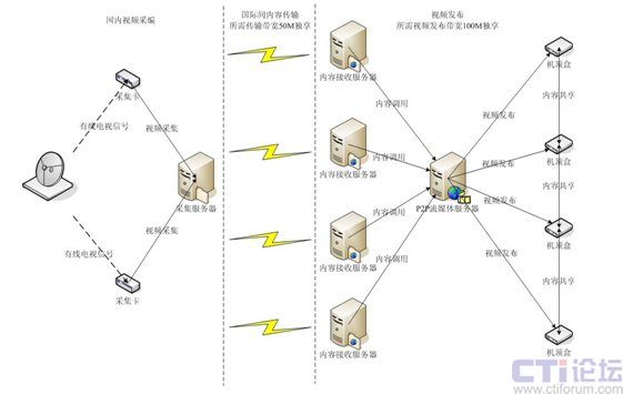 帶寬接入:用于國(guó)內(nèi)到國(guó)際的出口帶寬,使用大小為50M獨(dú)享,以滿足在有效時(shí)間內(nèi)可完成所有內(nèi)容的傳輸;用于國(guó)外用戶響應(yīng)發(fā)布的P2P流媒體服務(wù)器出口帶寬為100M,可滿足至少2000并發(fā)用戶的P2P直播點(diǎn)播觀看需求。