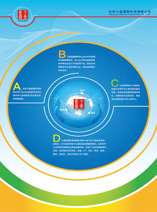 北京七星藍(lán)圖科技有限公司(7Runto)是一家專(zhuān)業(yè)開(kāi)發(fā)和提供呼叫中心排班管理軟件、運(yùn)營(yíng)管理系統(tǒng)、座席應(yīng)用軟件的服務(wù)商,是北京市高新技術(shù)企業(yè)和雙軟企業(yè),是北京市高企協(xié)會(huì)會(huì)員。七星藍(lán)圖擁有自主知識(shí)產(chǎn)權(quán)的產(chǎn)品RuntoCRM、RuntoWFM等,致力于用創(chuàng)新的技術(shù)和服務(wù),為客戶(hù)提供呼叫中心業(yè)務(wù)及運(yùn)營(yíng)管理整體解決方案,幫助客戶(hù)實(shí)現(xiàn)業(yè)務(wù)流程和管理流程軟件化,改善和提升運(yùn)營(yíng)體系,減低成本和增加客戶(hù)核心競(jìng)爭(zhēng)力。
