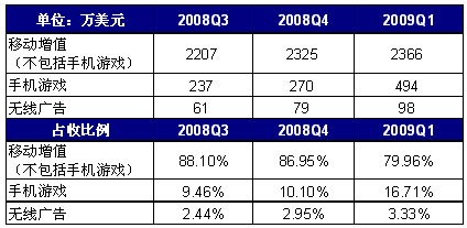 空中網(wǎng)2009年第1季度總營(yíng)收為2960萬(wàn)美元,其中總無(wú)線增值服務(wù)(不包括手機(jī)游戲)營(yíng)收為2366萬(wàn)美元,同比增長(zhǎng)19%,比上一季度增長(zhǎng)2%,占總營(yíng)收的79.96%,而手機(jī)游戲和無(wú)線廣告分別占比16.71%、3.33%。易觀國(guó)際(Analysys International)認(rèn)為,對(duì)于空中網(wǎng)2009年第1季度市場(chǎng)表現(xiàn)應(yīng)關(guān)注以下幾點(diǎn):