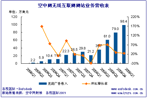 空中網(wǎng)第一季度移動(dòng)無(wú)線互聯(lián)網(wǎng)網(wǎng)站營(yíng)收為98萬(wàn)美元,同比增長(zhǎng)309%,比上一季度增長(zhǎng)24%。空中網(wǎng)在kong.net品牌優(yōu)勢(shì)明顯的基礎(chǔ)上不斷推出優(yōu)質(zhì)的體育內(nèi)容,繼NBA、CBA后,空中網(wǎng)于2009年初與體壇傳媒簽訂合作關(guān)系,獲得傳媒電信增值業(yè)務(wù)的獨(dú)家授權(quán),同時(shí)取得體壇傳媒旗下8刊一網(wǎng)的全部?jī)?nèi)容版權(quán)。易觀國(guó)際認(rèn)為,優(yōu)質(zhì)的體育資源將為空中網(wǎng)帶來(lái)與之相關(guān)的大量廣告主資源。