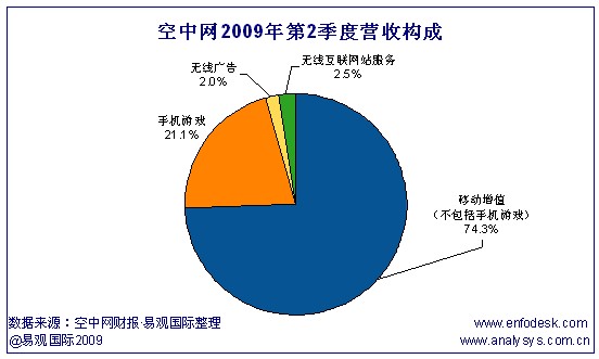 空中網(wǎng)2009年第2季度總營(yíng)收為3230萬(wàn)美元,其中總無(wú)線(xiàn)增值服務(wù)(不包括手機(jī)游戲)營(yíng)收為2393萬(wàn)美元,同比增長(zhǎng)10%,比上一季度增長(zhǎng)1%,占總營(yíng)收的74.09%;手機(jī)游戲占總營(yíng)收的21.05%,比上一季度增長(zhǎng)38%;這一季度,空中網(wǎng)將無(wú)線(xiàn)廣告和無(wú)線(xiàn)互聯(lián)網(wǎng)站服務(wù)的收入共同歸為無(wú)線(xiàn)互聯(lián)網(wǎng)服務(wù)營(yíng)收,總值為156萬(wàn)美元,其中41%來(lái)自于無(wú)線(xiàn)廣告,59%來(lái)自于空中網(wǎng)無(wú)線(xiàn)互聯(lián)網(wǎng)站服務(wù)(包括虛擬物品銷(xiāo)售以及手機(jī)游戲和無(wú)線(xiàn)增值服務(wù)的交叉銷(xiāo)售)。易觀國(guó)際(Analysys