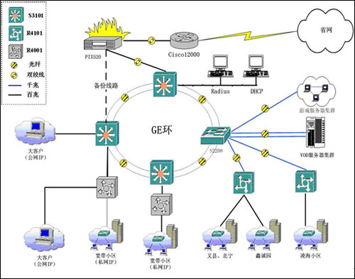 此城域網(wǎng)結(jié)構(gòu)清晰,由核心層的三層交換機(jī)只負(fù)責(zé)數(shù)據(jù)的快速轉(zhuǎn)發(fā),對業(yè)務(wù)匯聚和用戶的認(rèn)證控制任務(wù)全部由接入服務(wù)器R4000來完成。要求接入服務(wù)器支持多種認(rèn)證手段、加強(qiáng)對各類用戶實(shí)現(xiàn)不同級別的控制、為用戶的訪問提供安全保障措施、結(jié)合Radius系統(tǒng)提供多種計(jì)費(fèi)功能。
