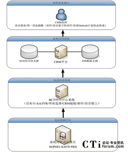 原先電話系統(tǒng)與CRM系統(tǒng)是獨(dú)立的兩個系統(tǒng),客服人員面對大量的客戶,迅速的獲悉來電客戶的身份、背景資料以及歷史資料在很大程度上決定了其服務(wù)質(zhì)量。BCT呼叫中心系統(tǒng)位于PBX與CRM之間,作為一個中間的橋梁,對PBX送來的電話信息或者用戶輸入的卡號等數(shù)據(jù)進(jìn)行處理分析,對主叫號碼或用戶輸入卡號進(jìn)行識別后,傳遞給CRM;CRM檢索與其相連的HIS(醫(yī)院信息系統(tǒng))的數(shù)據(jù)庫,將客戶資料以及相關(guān)的歷史記錄通過彈出網(wǎng)頁的模式,同步的顯示在坐席的計(jì)算機(jī)上,方便客服代表的輸入和后續(xù)操作,提高了效率與正確率。同時(shí),客戶代表還可以在CRM頁面中點(diǎn)擊電話號碼,通過BCT發(fā)起電話呼叫來聯(lián)系客戶,來處理用戶回訪等工作。