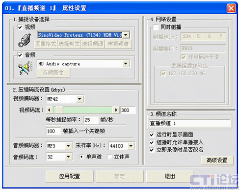 我們是利用電視卡來進行遠教衛(wèi)星電視節(jié)目的校園網絡實時直播,因此選擇“采集硬件設備”項,進入硬件設置,如下圖: