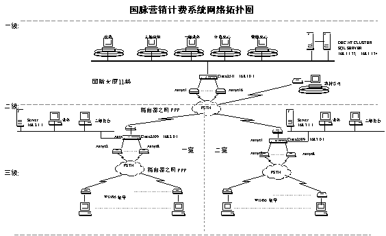 一級為計費中心,位于國脈大廈內,作為整個系統(tǒng)的運行中心和數據中心,也是整個系統(tǒng)的樞紐。二級主要位于二個營業(yè)室,是整個系統(tǒng)的分中心。三級為各營業(yè)所和代銷點,分散在全市各處是整個系統(tǒng)的數據基礎。