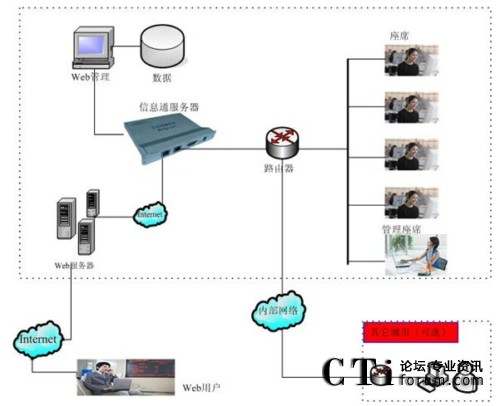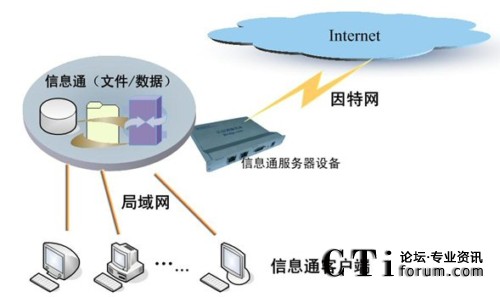 信息通系統(tǒng)的軟硬件部署,主要包括三個(gè)部分:信息通用戶(hù)工作平臺(tái)(客戶(hù)端)、信息通服務(wù)器(嵌入式設(shè)備)、數(shù)據(jù)/文件/管理服務(wù)器(其它應(yīng)用)。其中,在實(shí)際應(yīng)用中,信息通服務(wù)器與數(shù)據(jù)/文件服務(wù)器可以根據(jù)實(shí)際情況整合為一臺(tái)服務(wù)器。另外,整個(gè)系統(tǒng)通過(guò)應(yīng)用網(wǎng)關(guān)——信息通服務(wù)器設(shè)備——與Internet連接,所以,信息通服務(wù)器與應(yīng)用服務(wù)器為同一臺(tái)服務(wù)器。