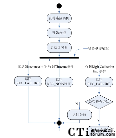 4)如果接收到SC_EVENT_DISCCONET事件,表示用戶主動放棄,返回REC_FAILURE,調用EndSession,流程結束;如果接收到SC_EVENT_TIMEOUT事件,表示用戶在計時器的時間內沒有輸入,返回REC_NOINPUT,調用EndSession,流程結束;如果接收到SC_EVENT_DTMF_RECEIVED事件,表示用戶輸入完畢,進入下一步;