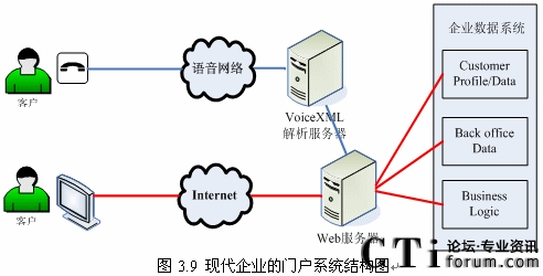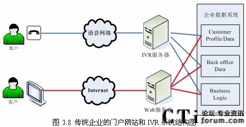 隨著Internet和Web技術(shù)的迅速發(fā)展,越來(lái)的企業(yè)開始建立自己的門戶網(wǎng)站,同時(shí)又擁有自己的IVR系統(tǒng)(如圖3.8所示),但是兩套系統(tǒng)完全獨(dú)立,語(yǔ)音系統(tǒng)和數(shù)據(jù)系統(tǒng)沒有任何交互或者只有很少的交互。而建立IVR系統(tǒng)的目標(biāo)就是給客戶更好的體驗(yàn),使客戶能方便的通過(guò)電話完成更多以前需要登陸企業(yè)門戶網(wǎng)站,或者親自去企業(yè)或其網(wǎng)點(diǎn)去辦理的業(yè)務(wù),這就需要IVR系統(tǒng)能跟后臺(tái)數(shù)據(jù)系統(tǒng)有更多更好的交互!罢Z(yǔ)音門戶”的概念出現(xiàn)也愈發(fā)的證明這一點(diǎn)。