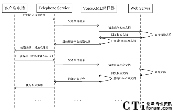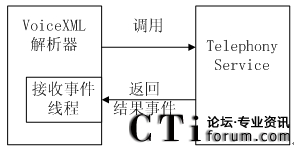 當(dāng)VoiceXML解析器做完解析工作之后,遇到需要語(yǔ)音操作時(shí),就得依靠調(diào)用Telephoney API來(lái)完成,同時(shí)Telephony Service需要向VoiceXML解析器去返回相應(yīng)的語(yǔ)音操作結(jié)果事件。圖3.15描述了這一過(guò)程。