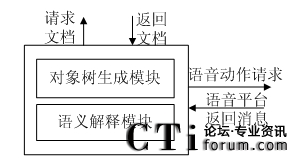 作為VoiceXML語(yǔ)言的解釋工具,文檔解析是VoiceXML解析器主要任務(wù),也是執(zhí)行引擎的重要組成部分,文檔解析的內(nèi)容決定了執(zhí)行平臺(tái)的下一步操作,也是整個(gè)系統(tǒng)運(yùn)行的核心。因?yàn)閂oiceXML文檔首先是一個(gè)XML文檔,所以主要包含對(duì)象樹生成模塊和語(yǔ)義解釋模塊兩個(gè)部分。其中對(duì)象樹生成模塊是對(duì)VoiceXML文檔進(jìn)行XML方式的解析,解釋模塊使用FIA算法對(duì)生成的對(duì)象進(jìn)行解析。圖3.13描述了VoiceXML解析器文檔解析的模型。