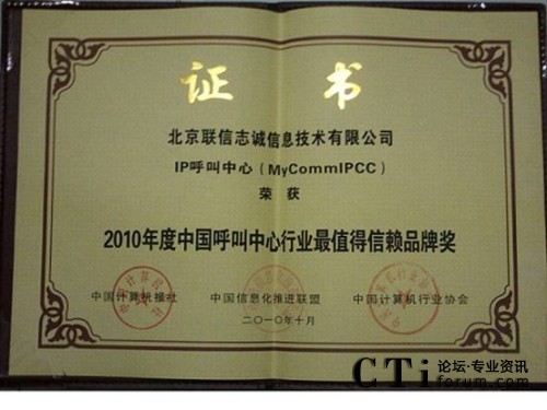 CTI論壇(ctiforum)11月1日消息(記者 潘婷婷):近日,在國(guó)家信息化專家咨詢委員會(huì)的指導(dǎo)下,作為中國(guó)信息化發(fā)展重要推動(dòng)力量的中國(guó)計(jì)算機(jī)報(bào)社、中國(guó)計(jì)算機(jī)行業(yè)協(xié)會(huì)、中國(guó)信息化推進(jìn)聯(lián)盟等國(guó)家級(jí)權(quán)威媒體及國(guó)家信息化領(lǐng)域一級(jí)權(quán)威機(jī)構(gòu),共同組織開展“2010中國(guó)行業(yè)信息化讀者選擇獎(jiǎng)評(píng)選”,重點(diǎn)展示信息化在行業(yè)應(yīng)用中的優(yōu)秀應(yīng)用案例、產(chǎn)品及解決方案。由中國(guó)計(jì)算機(jī)報(bào)社組織業(yè)內(nèi)專家,在經(jīng)過歷時(shí)3個(gè)月的產(chǎn)品征集、方案論證、專家評(píng)審后,北京聯(lián)信志誠(chéng)信息技術(shù)有限公司(簡(jiǎn)稱MyComm公司),其核心產(chǎn)品MyCommIPCC獨(dú)占2010年中國(guó)呼叫中心行業(yè)最值得信賴品牌獎(jiǎng)。