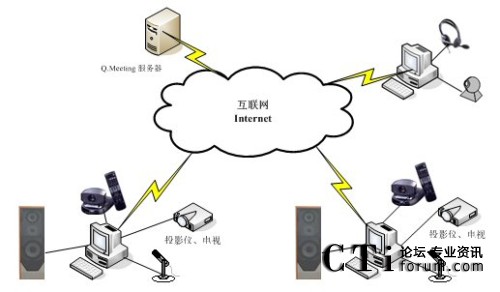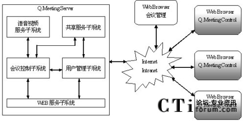 系統(tǒng)選用北京億方連線通訊技術有限公司具有國際先進水平的全新第四代網(wǎng)絡視頻協(xié)作會議中心Q.Meeting為核心進行構(gòu)建,該系統(tǒng)由會議服務器Q.Meeting Server和基于IE 瀏覽器的客戶端組成。Q.Meeting Server運行于一臺服務器上,構(gòu)成網(wǎng)絡會議中心,提供會議控制、視頻服務、語音服務、共享服務、WEB服務和會議用戶管理等功能。所有參加會議的人員只需通過IE瀏覽器訪問會議中心網(wǎng)站就可以參加會議,通過訪問會議頁面和嵌于其中的客戶端插件Q.Meeting Control實現(xiàn)音頻和數(shù)據(jù)共享等交流。