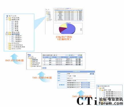 客戶關(guān)系管理,以KPI分析器(KAU)、查詢分析器(SAU)、類型分析器(TAU)為核心,實(shí)現(xiàn)客戶信息管理、查詢、分類、挖掘的目標(biāo)需求: