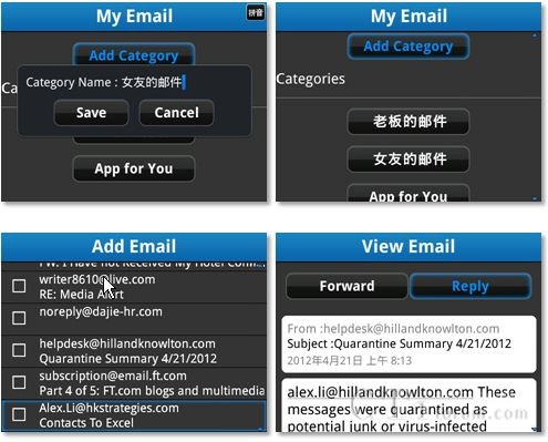 及時(shí)、安全的郵件收發(fā)是黑莓手機(jī)用戶鐘愛(ài)黑莓的重要原因之一。然而,當(dāng)成千上百封郵件堆積在郵件系統(tǒng)內(nèi),疏于整理和歸類,以至于你無(wú)法找到或者挑選你想要的那封郵件中的信息時(shí),你可能就沒(méi)那么Happy了吧?My Email應(yīng)用,可以稱之為你郵件系統(tǒng)的“管家婆”,安裝了它之后,你可以將所有郵件有條理的進(jìn)行分類管理:公私分明、客戶分明、項(xiàng)目分明、老板同事分明,想瀏覽哪類郵件一目了然。此外,對(duì)于那些及其重要的郵件,“管家婆”還可以幫你儲(chǔ)存在SD卡上,即使原郵件已經(jīng)被刪除,儲(chǔ)存的郵件也可以被找回,如此一來(lái),有限的手機(jī)存儲(chǔ)空間中就不必再存儲(chǔ)大量無(wú)關(guān)緊要的各種郵件,騰點(diǎn)空間給你心水的各種音樂(lè)圖片和視頻吧。