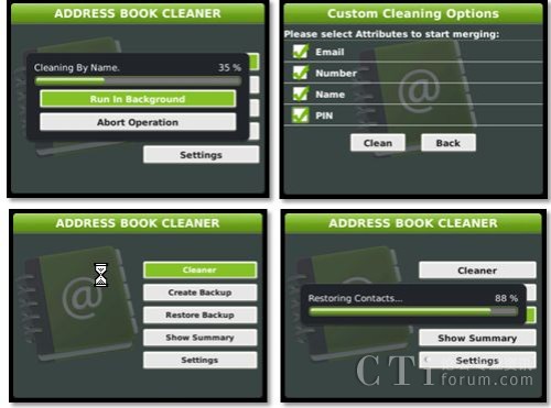 同事、同學(xué)、朋友、家人、客戶、合作伙伴…你的黑莓手機(jī)中存了多少聯(lián)系人了?其中又是否有重復(fù)存儲(chǔ)呢?一款名為Address Book Cleaner應(yīng)用,可以幫助你整理和合并黑莓手機(jī)中的重復(fù)聯(lián)系人信息。該應(yīng)用可設(shè)置按照重復(fù)姓名、號(hào)碼、電子郵件地址、PIN碼等進(jìn)行查重、合并和刪除,并可在整理結(jié)束后給出整理報(bào)告。同時(shí),Address Book Cleaner還可以隨時(shí)隨地將通訊薄中的聯(lián)系人信息進(jìn)行備份和恢復(fù),可讓用戶在無(wú)法與PC的BlackBerry Desktop Manager連接的時(shí)候,也可以輕松進(jìn)行聯(lián)系人的備份和恢復(fù)操作。