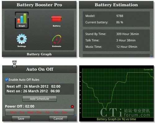 安裝了這么多應(yīng)用,很多同學(xué)會(huì)考慮我的電池還能hold的住嗎?此次,特別為大家介紹一款名為Battery Booster Pro的手機(jī)電量管理應(yīng)用,它可以通過(guò)自身具備的五大功能很好的幫用戶管理黑莓手機(jī)電量:1. 規(guī)則制定:用戶可以通過(guò)它為黑莓手機(jī)中的應(yīng)用設(shè)定監(jiān)測(cè)規(guī)則,一旦用戶忘記關(guān)閉某應(yīng)用,Battery Booster Pro就會(huì)跳出警告標(biāo)志; 2. 自動(dòng)開(kāi)/關(guān)手機(jī):用戶可以為自己的手機(jī)設(shè)定自動(dòng)開(kāi)關(guān)時(shí)間,以節(jié)省不必要得電量消耗;3. 電量提醒,當(dāng)電量低于一定的百分比后,該應(yīng)用就會(huì)自動(dòng)提示用戶;4. 電量追蹤,Battery Booster Pro還可以通過(guò)直觀的圖表顯示出設(shè)備一天內(nèi)的電量消耗狀況;5. 電量預(yù)測(cè),該應(yīng)用還可以預(yù)測(cè)出手機(jī)所剩的電量在待機(jī)、聽(tīng)音樂(lè)和電話等情況下的工作時(shí)長(zhǎng)。